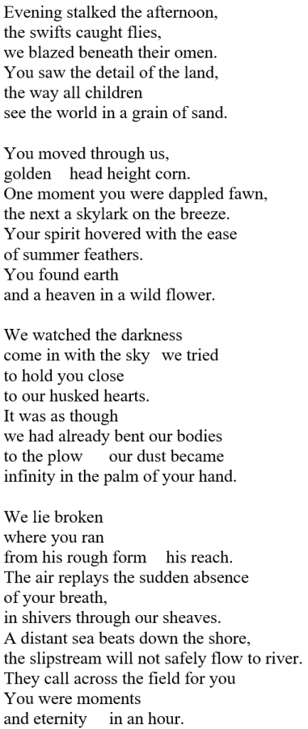 Lauren is currently a second year on the MA in writing poetry with Poetry School London, with Newcastle University. She has been published in various print and online publications, most recently Lighthouse Magazine and Magma. She also published a pamphlet, Silver Hare Tales, with Blood Moon Poetry in December 2021. Twitter:@laurenmywrites