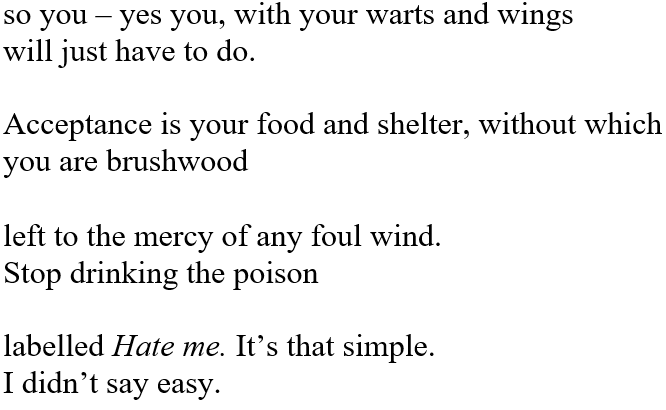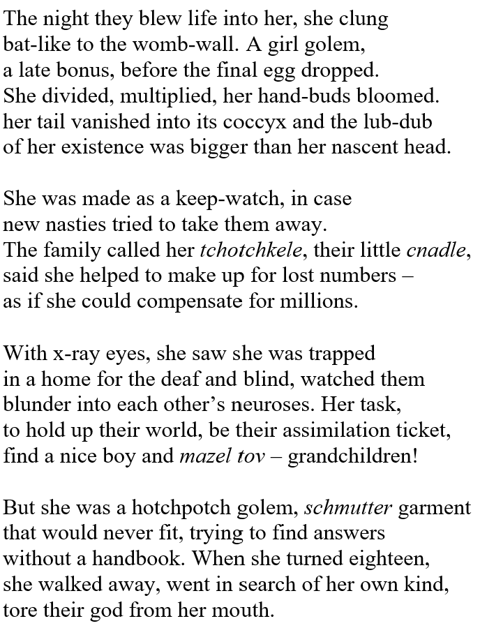 Rachael Clyne from Glastonbury, is published in journals including: Atrium, Iamb, Ink Sweat & Tears, Lighthouse , Rialto, Shearsman and Tears in the Fence. Recent anthologies: #Metoo, Out on the Page, Rebeltalk. Rachael has been a professional actor and a psychotherapist. Her passions are eco-issues and identity. Her prizewinning collection, Singing at the Bone Tree (Indigo Dreams), concerns our broken connection with nature. Her pamphlet, Girl Golem (4word.org) explores her Jewish migrant heritage and sense of otherness. Facebook: Rachael Clyne or Twitter: @RachaelClyne1 Blog: https://rachaelclyne.blogspot.com/