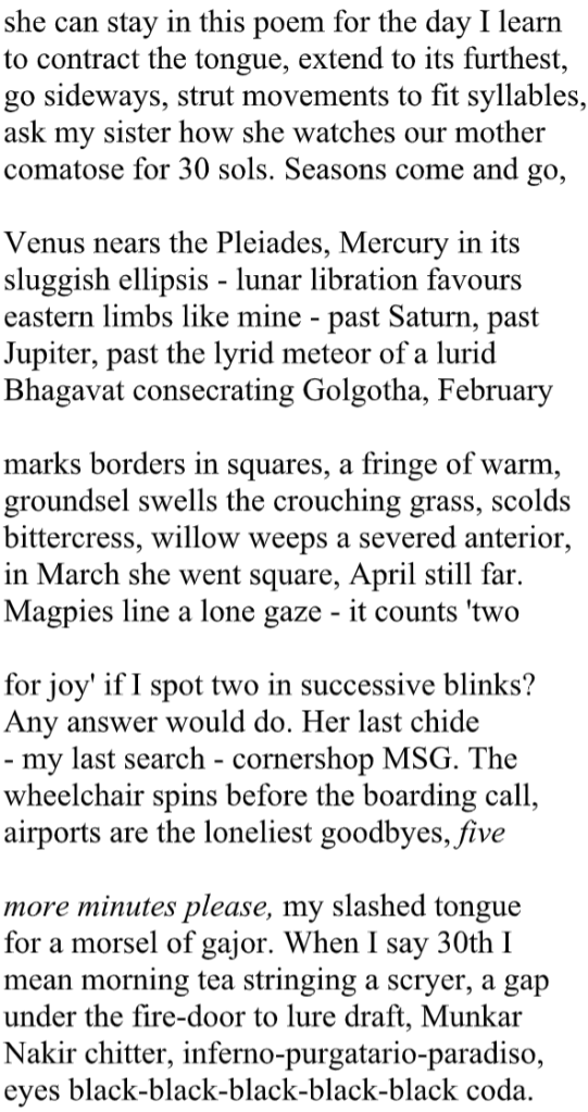 Taz Rahman is a Cardiff based poet of Bengali origin. His first poetry collection is forthcoming in February 2024 by Seren Books. Shortlisted for the 2022 Aesthetica Creative Writing Prize, he has been widely published including in Poetry Wales.