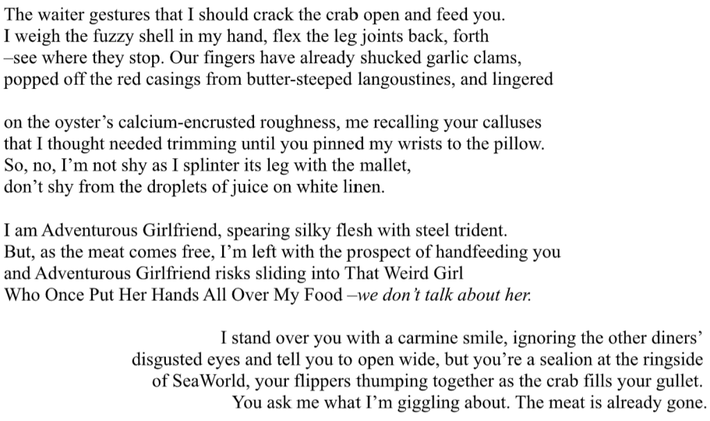 Jen Feroze lives by the sea in Essex. A former Foyle Young Poet, her work has recently appeared in a variety of publications including Poetry Wales, OneArt, Dust and Stanchion. She was a winner of the 2022/2023 Magma Editors’ Prize, and her debut pamphlet is forthcoming with Nine Pens. Find her on Twitter @jenlareine and on instagram @the_colourofhope.
