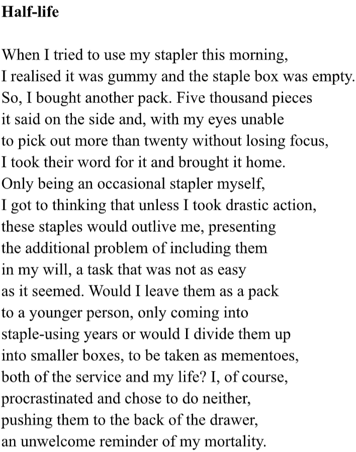 Sam Szanto lives in Durham, UK. Her poetry pamphlet, ‘Splashing Pink’ was published by Hedgehog Press in 2023. She is published in literary journals including ‘The North’, and won the Charroux Poetry Prize and the First Writer International Poetry Prize. Find her at samszanto.com or on X (Twitter) at sam_szanto