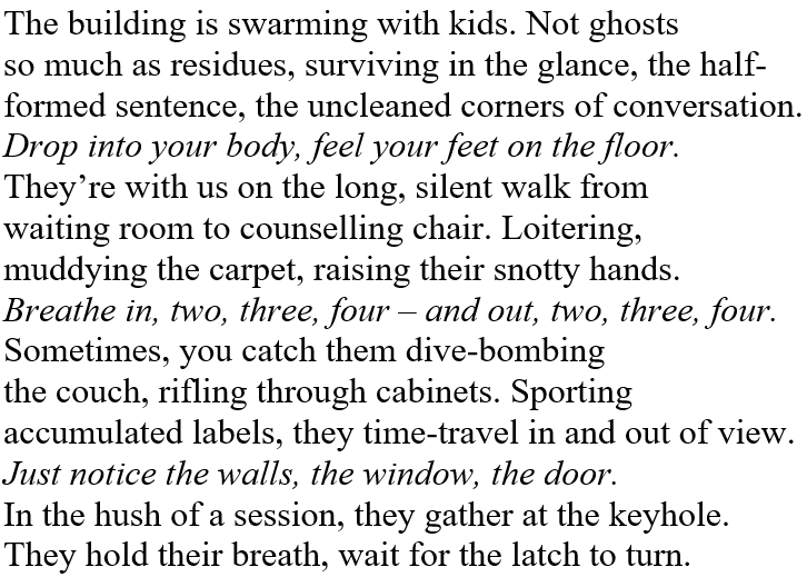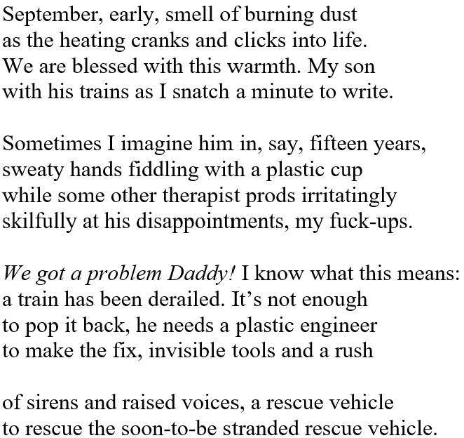 ‘A fascinating and formally coherent collection that draws on the poet’s first-hand experience of psychotherapy, offering us a privileged insight into his world. Exploring the day to day of professional practice, Totman takes a compelling and highly original perspective on work and human relations, love and relationships, childhood, parenthood and play. Each sonnet is a room, a session, a question, an interrogation, a reflection, a realisation, each poem a vignette informed by life and observation, concerned with knowing others and in turn the self. A journey of beautifully crafted poems that celebrate the business and rituals of witness behind closed doors, the passing of minutes in words and silence, the things hard to say, the holding back and letting go, the rehearsals of loss, the quiet catastrophes.‘ Paul Stephenson
