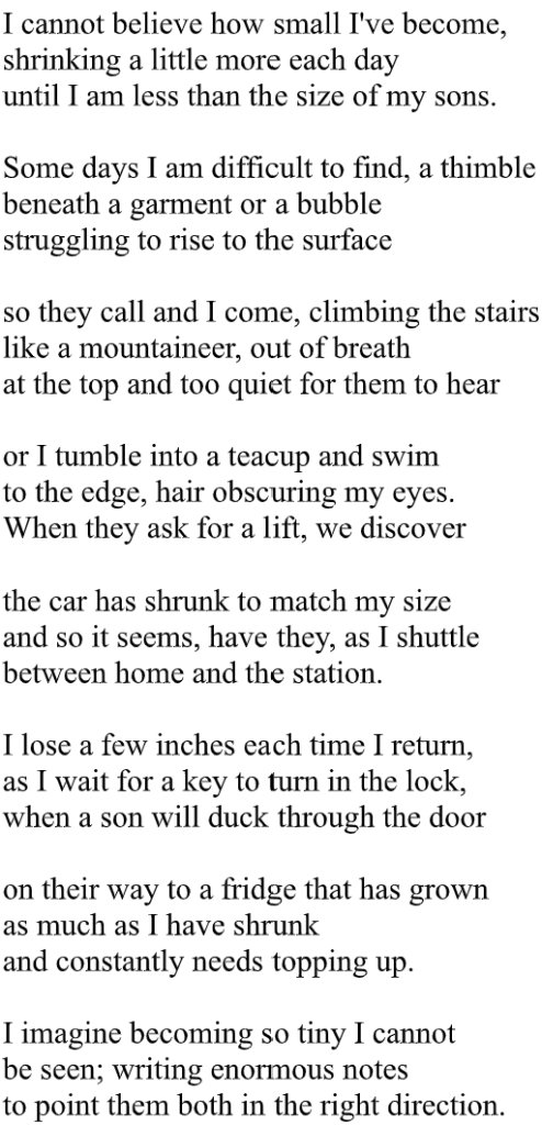MT Taylor’s work has appeared in Northwards Now, The Interpreter’s House, Glasgow Review of Books, Verve Press,Gutter, and Under the Radar. She now lives in Glasgow. Her four children still talk to her, and she still interrupts.
